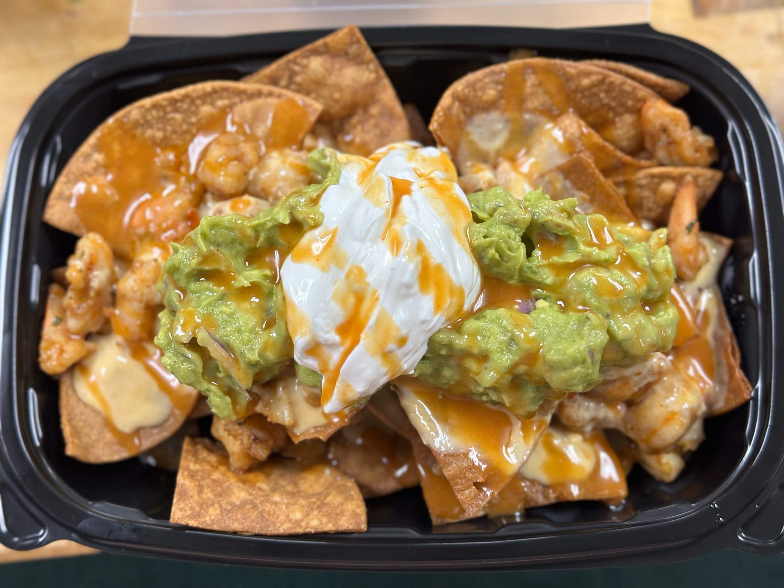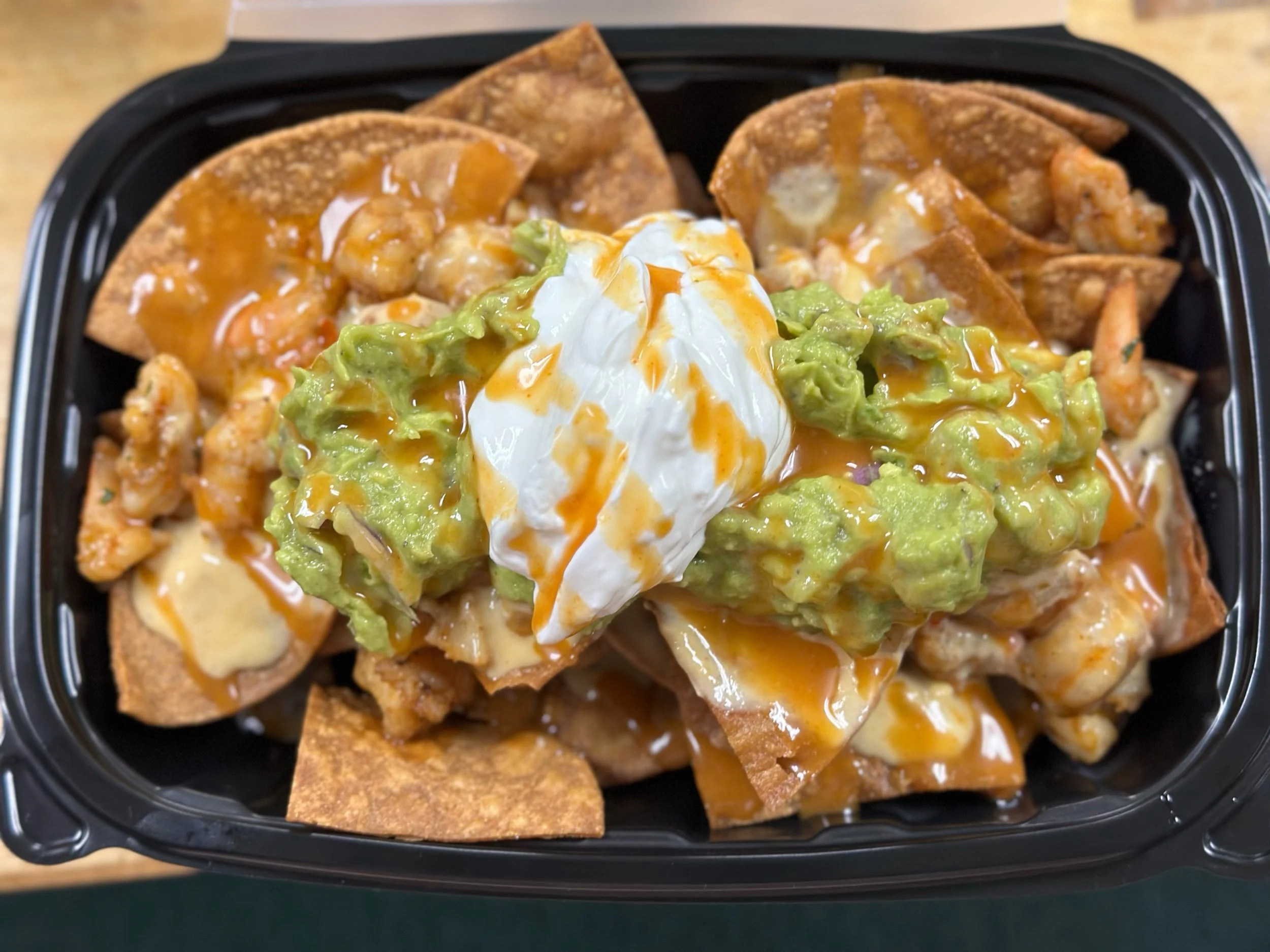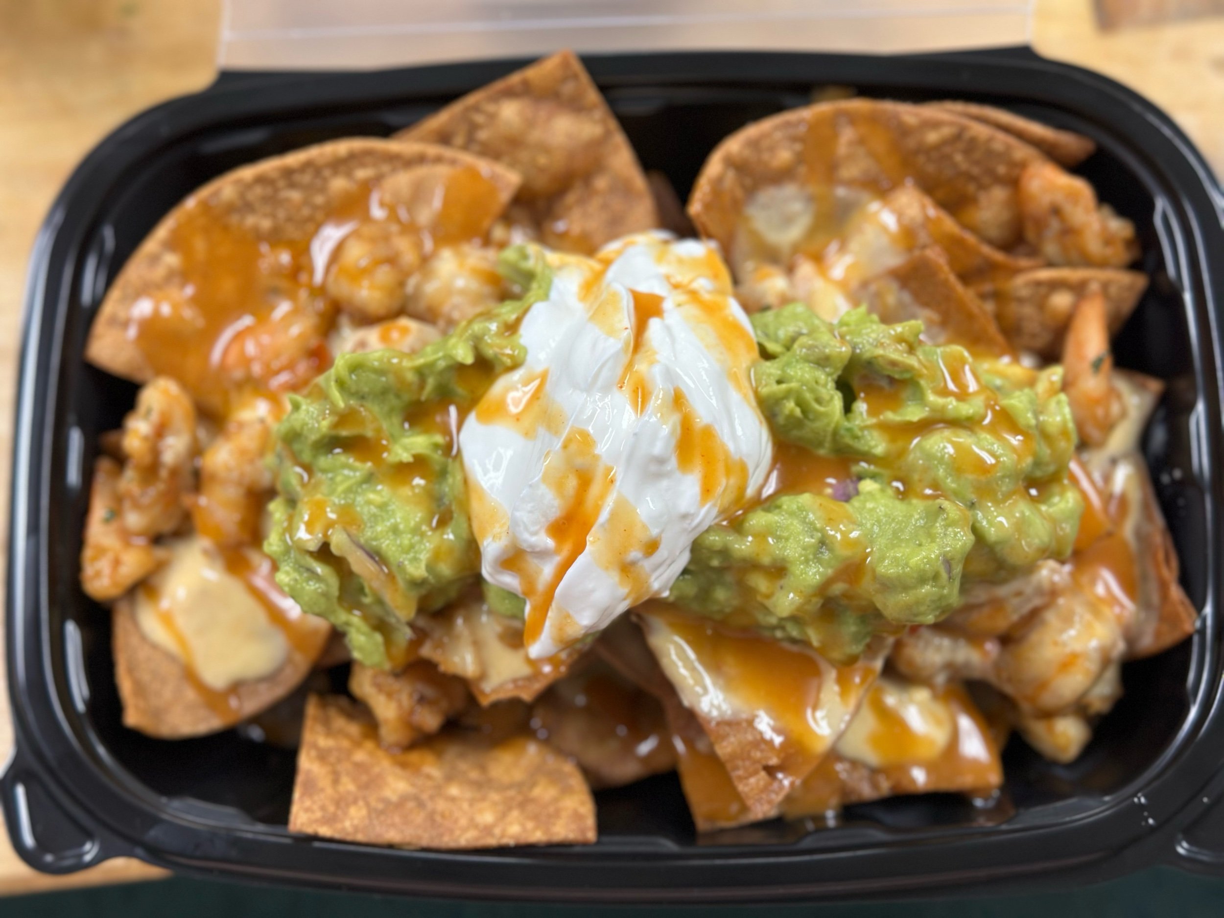 Order › Shrimp Nachos Image 1 of 3 Image 2 of 3 Image 3 of 3 Shrimp Nachos $15.00 Shrimp, queso, corn salsa (corn, purple onion, jalapeño), taco sauce, tortilla and doritos nacho cheese chips Quantity: Add To Cart Added! Shrimp, queso, corn salsa (corn, purple onion, jalapeño), taco sauce, tortilla and doritos nacho cheese chips